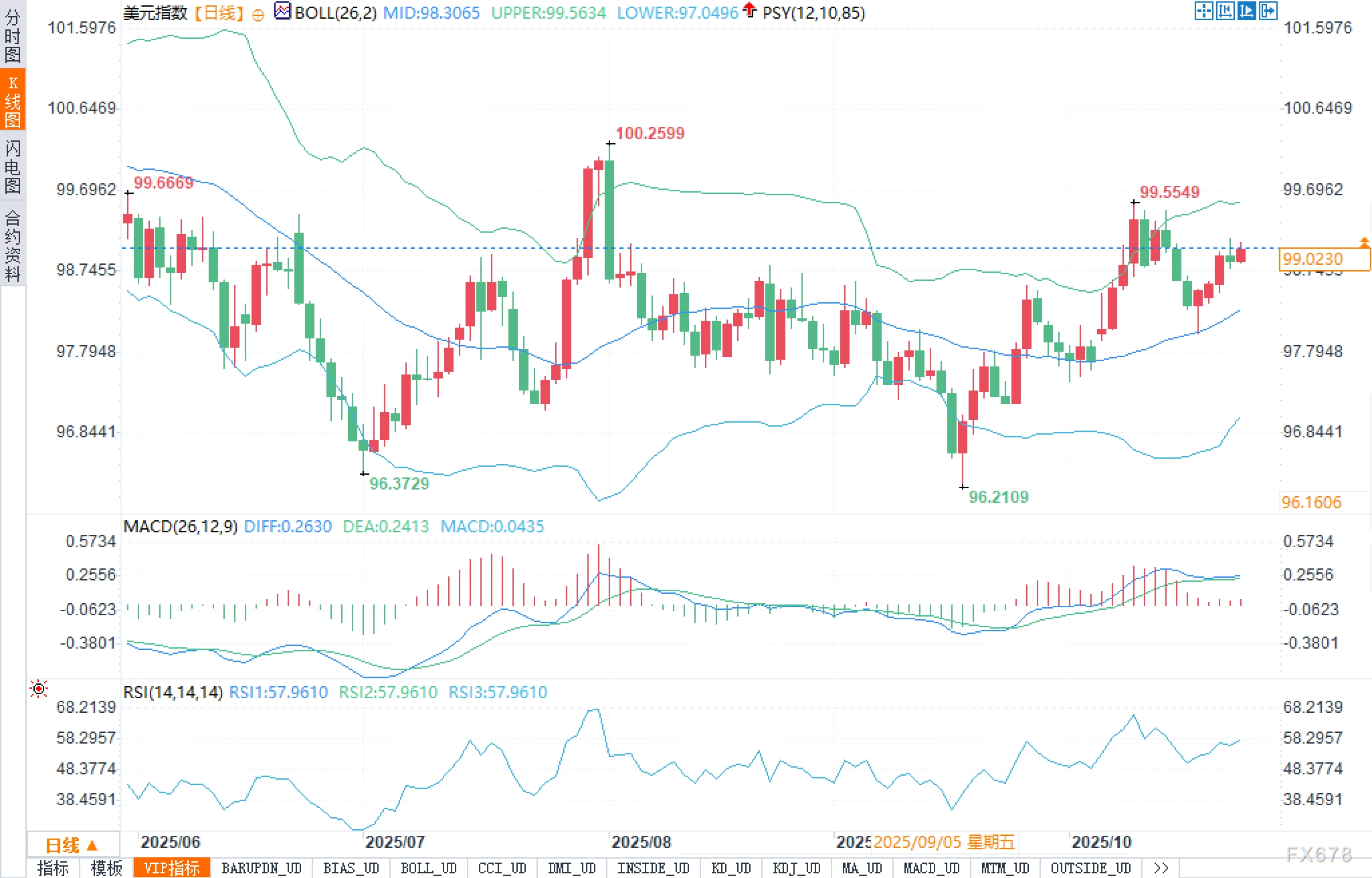 周四(10月23日),美元指数欧洲时段继续围绕99一线拉锯。过去一个多月,美元先在96.2109附近探底回升,随后上冲至99.5549后回落整理;更早前的阶段高点在100.2599。短线进入关键时间窗,数据与政策预期的小幅偏离就可能决定99一线是“中继站”还是“终点站”。