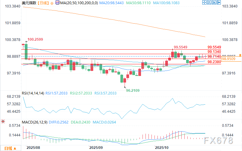 美元指数初步支撑位见于98.714,这一关键斐波那契回撤位在近期多个交易日中反复起到支撑作用。阻力位则维持在本周高点99.139。指数在这两个点位之间的震荡走势,体现出交易员在消化CPI数据、重新调整对短期货币政策预期过程中的犹豫心态。