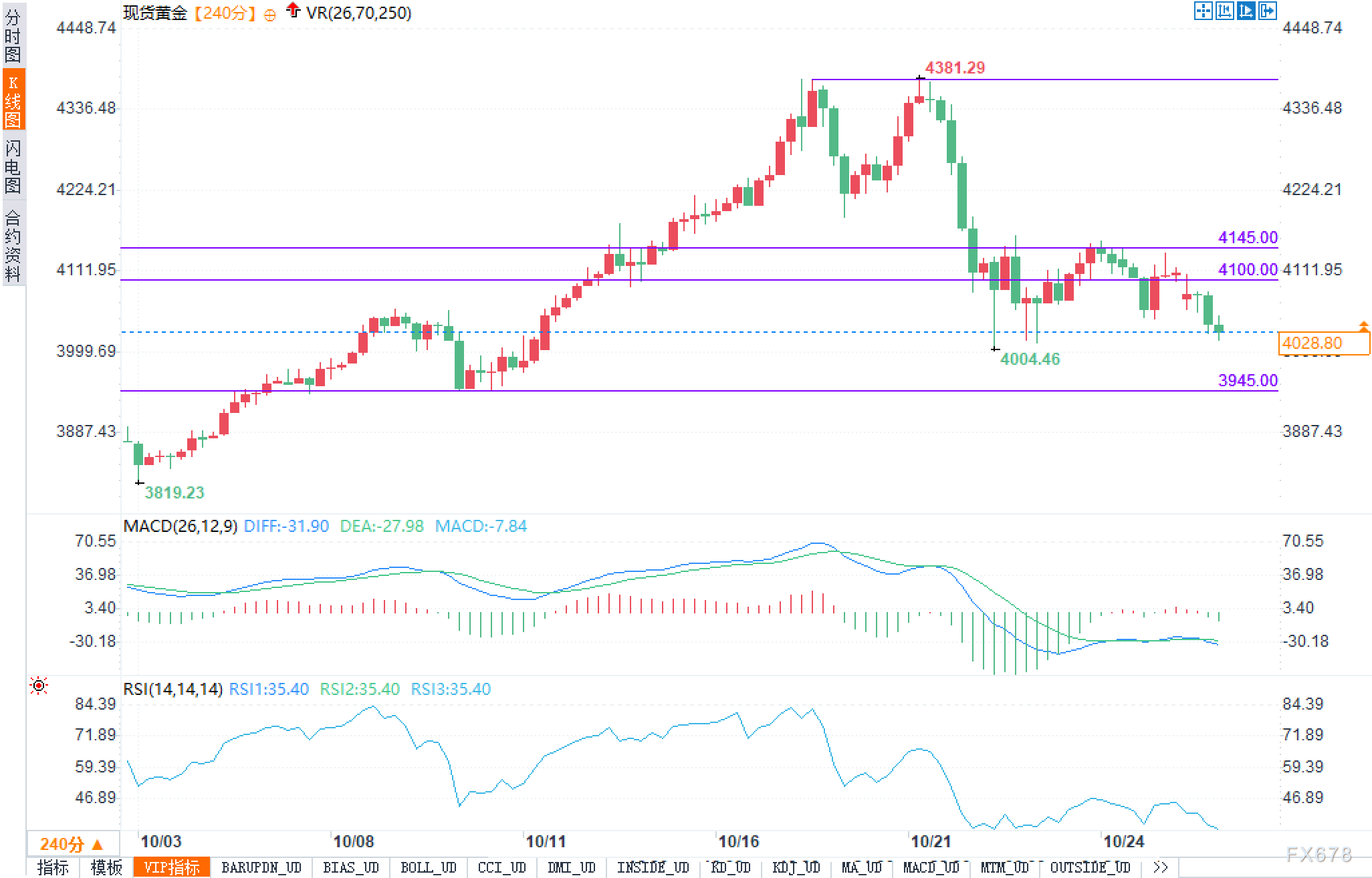 四小时图看,金价自4381高点回落后在4000—4100区间整理。结构上呈“低高点—低低点”的弱势震荡,4100与4145构成上方密集阻力;下方4004为近期枢轴,曾伴随长下影,承接力度可见,其下则关注3945的阶段性支撑。指标方面,MACD仍在零轴下方但绿柱缩短,空头动能边际减弱;RSI徘徊35附近,显示偏弱但未极端。综合而言,价格更像在3945—4145间构筑区间,后续观察能否有效收复4100及动能配合,再判断节奏是否由弱转稳。