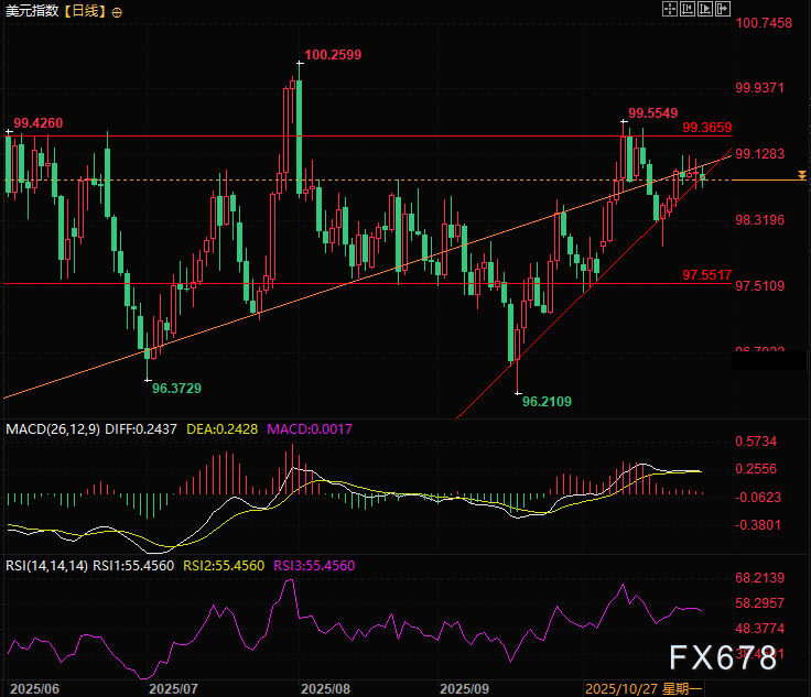 美元指数压力位为橙色颈线,以及99.36,支撑位为上升趋势线以及98.61和远处的97.55。