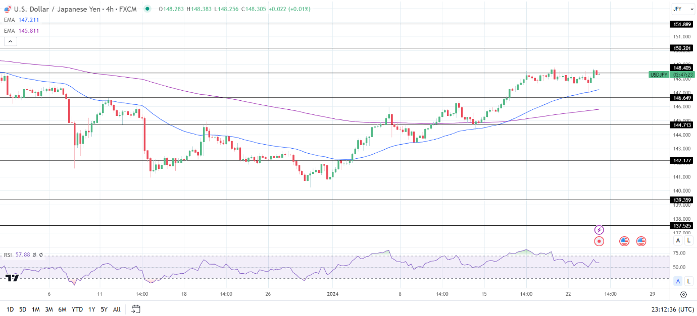 14周期4小时RSI为57.88,表明美元/日元在进入超买区域之前将回到149关口。