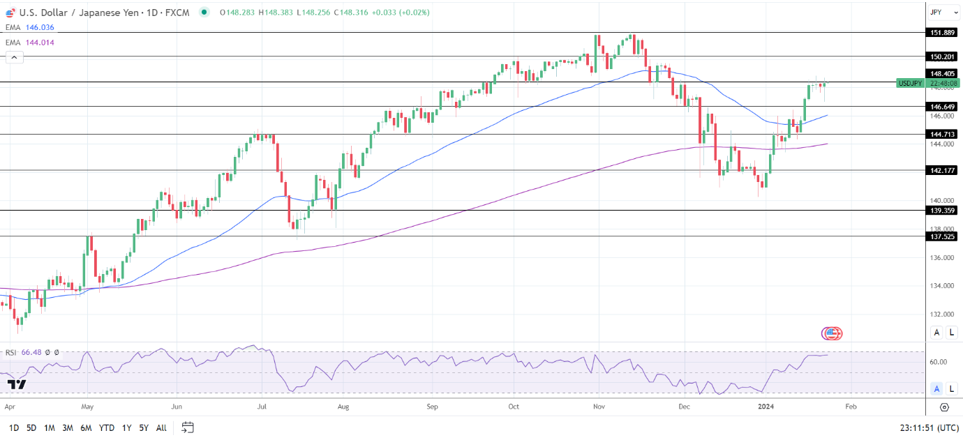14天RSI为66.48,表明美元/日元在进入超买区域之前将升至149关口。