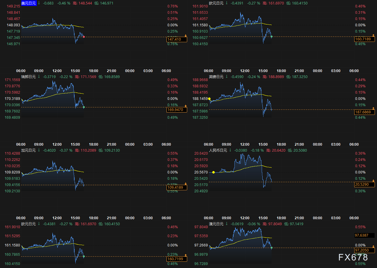 这使得大多数主要外汇货币兑日元走弱。截至北京时间16:42,美元兑日元报147.381,跌0.48%,欧元兑日元报160.5890,跌0.35%。澳元兑日元报97.1250.跌0.15%。