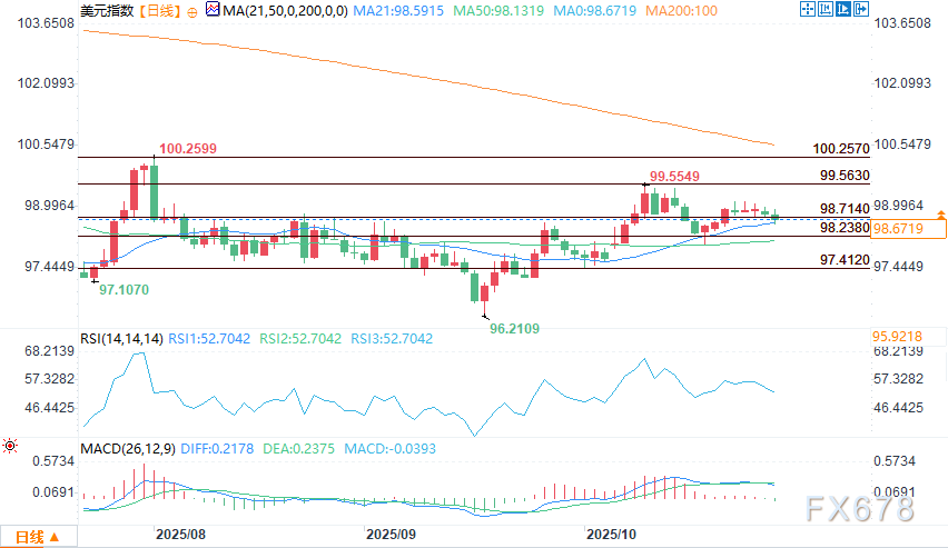 周二(10月28日),美元指数在周二盘中承压,延续了自10月22日高点99.139以来的四日回调,跌至98.668。价格已突破98.797的小枢纽点和98.650的61.8%回撤位,今日低点触及98.565。交易员们正在关注98.132的50日移动平均线,它可能成为逢低买入者的支撑位,也可能在失守后引发向97.462的更深幅下跌。