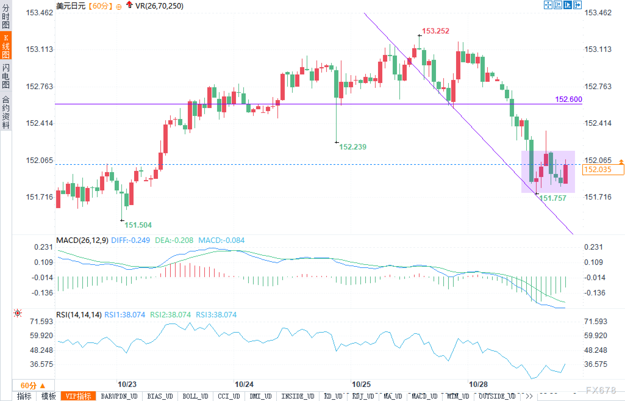 从小时级别K线图来看,美元兑日元在10月后段出现一轮冲高回落:上方153.252一线是近期高点,之后沿着一条明显的下降趋势线一路下滑,趋势线连接了高位回落阶段的多根阴线低点,具有典型的下降趋势线特征。