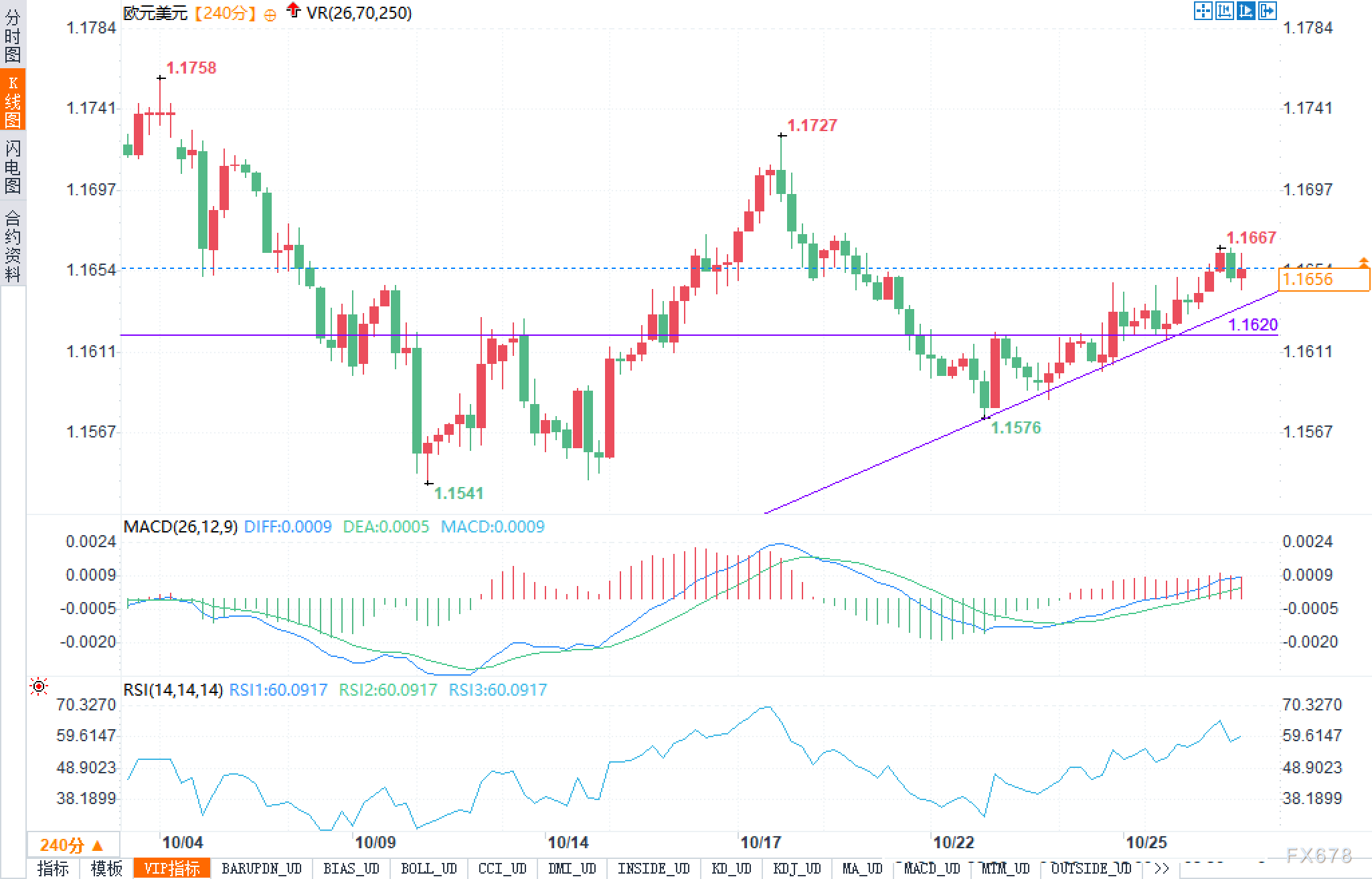从240分钟K线图来看,欧元兑美元在1.1541附近企稳后,经历了1.1727的快速冲顶,随后高位回撤,但在1.1576再次获得买盘支撑,形成更高的低点;之后汇价沿着一条自10月下旬以来的上升趋势线稳步抬高,该趋势线目前大致穿越1.1576与1.1620一线,显示多头市场在不断上移自己的防线。当前汇价已经运行在这条上升趋势线之上,说明多头仍掌控节奏,尚未被迫进入恐慌性止损。