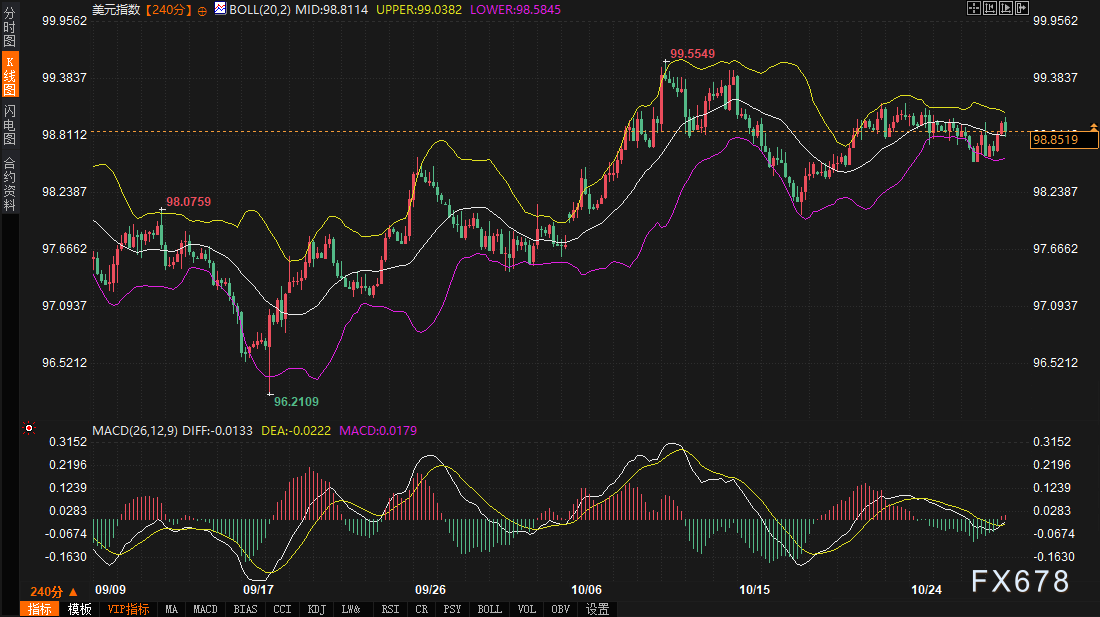 转向技术层面,美债、美元与黄金的240分钟图表,共同勾勒出债市主导的短期格局。美元指数当前报98.8460,布林带中轨98.8108提供即时支撑,上轨99.0379则作为反弹目标。MACD指标DIFF -0.0135高于DEA -0.0223,柱状线虽仍为负值,但零轴下方收敛迹象初现,暗示债市收益率企稳后,美元动能可能从弱势转向中性。日内0.12%涨幅虽温和,却已消化贸易谈判的初步乐观,关键在于美联储发布会后,是否能守住98.5844下轨,避免滑向近期低点。