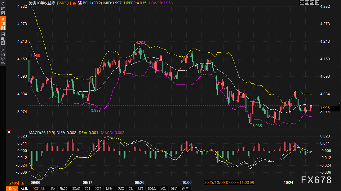 债市与美元的联动并非线性,而是通过收益率敏感性放大。当前,美债收益率中轨稳守3.997,若4%关口失守,可能引发美元指数向99.0379上轨的试探;反之,收益率回落至3.958下轨,将考验美元在98.5844支撑的稳固性。这种债市主导的传导机制,确保美元在美联储事件前后保持韧性,而非单纯依赖贸易叙事。