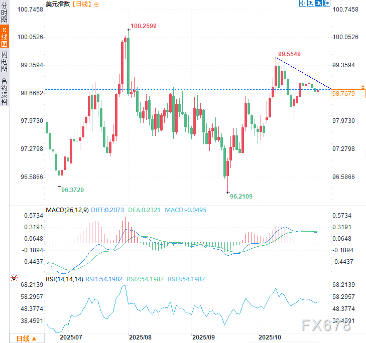 周三美元指数于98.77附近窄幅震荡,近期美元指数呈下行走向,短线或仍倾向震荡偏弱运行。