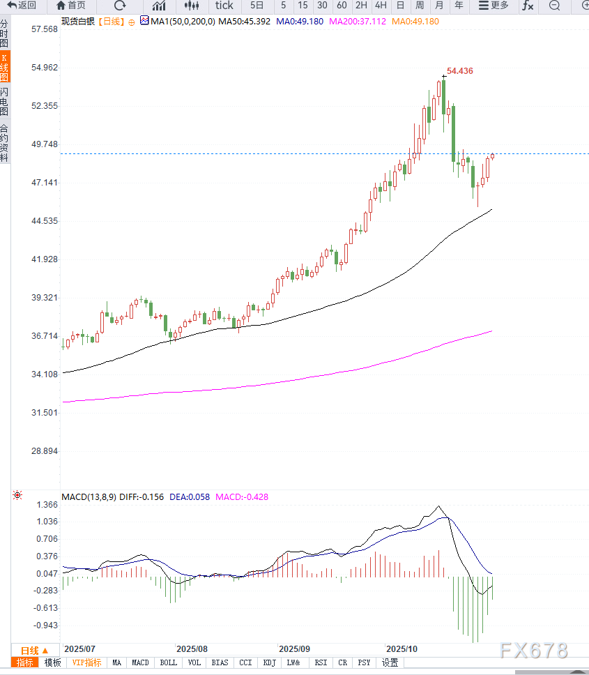 分析人士认为,若银价跌破48.50美元支撑,短线或回调测试44美元区间;若突破49.50美元,则可能重新启动上行趋势。