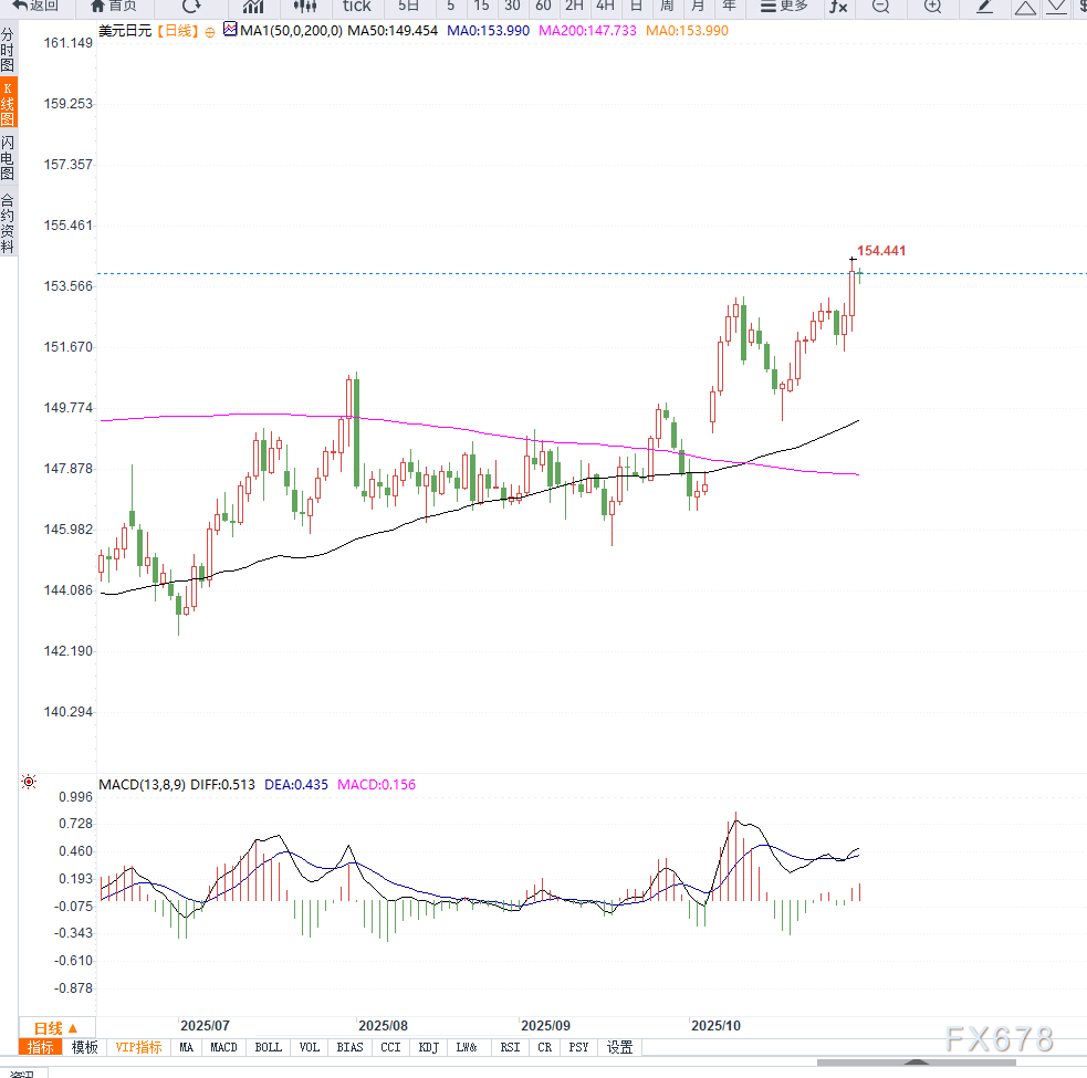 从技术图形来看,美元兑日元在153.30上方企稳,该区域由前期高点转化为支撑。日线震荡指标维持在积极区间,尚未进入超买状态,暗示短线仍有上行动力。