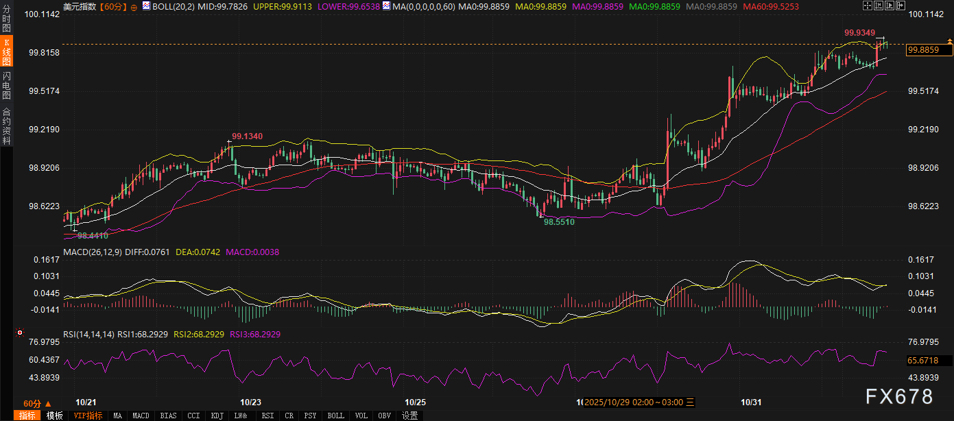 周一 (11月03日),美元指数在亚洲和欧洲交易时段呈现出温和反弹的态势,现货价格在关键的技术阻力位附近窄幅波动。截至本文撰写时,美元指数报价为 99.8739,日内小幅上涨 0.17%,显示出市场在等待进一步指引前的谨慎买盘情绪。尽管技术面短线有所支撑,但基本面却受到美国国内经济和政策不确定性的挑战,这种基本面与技术面短期分化的格局,成为当前盘面的主要特征。