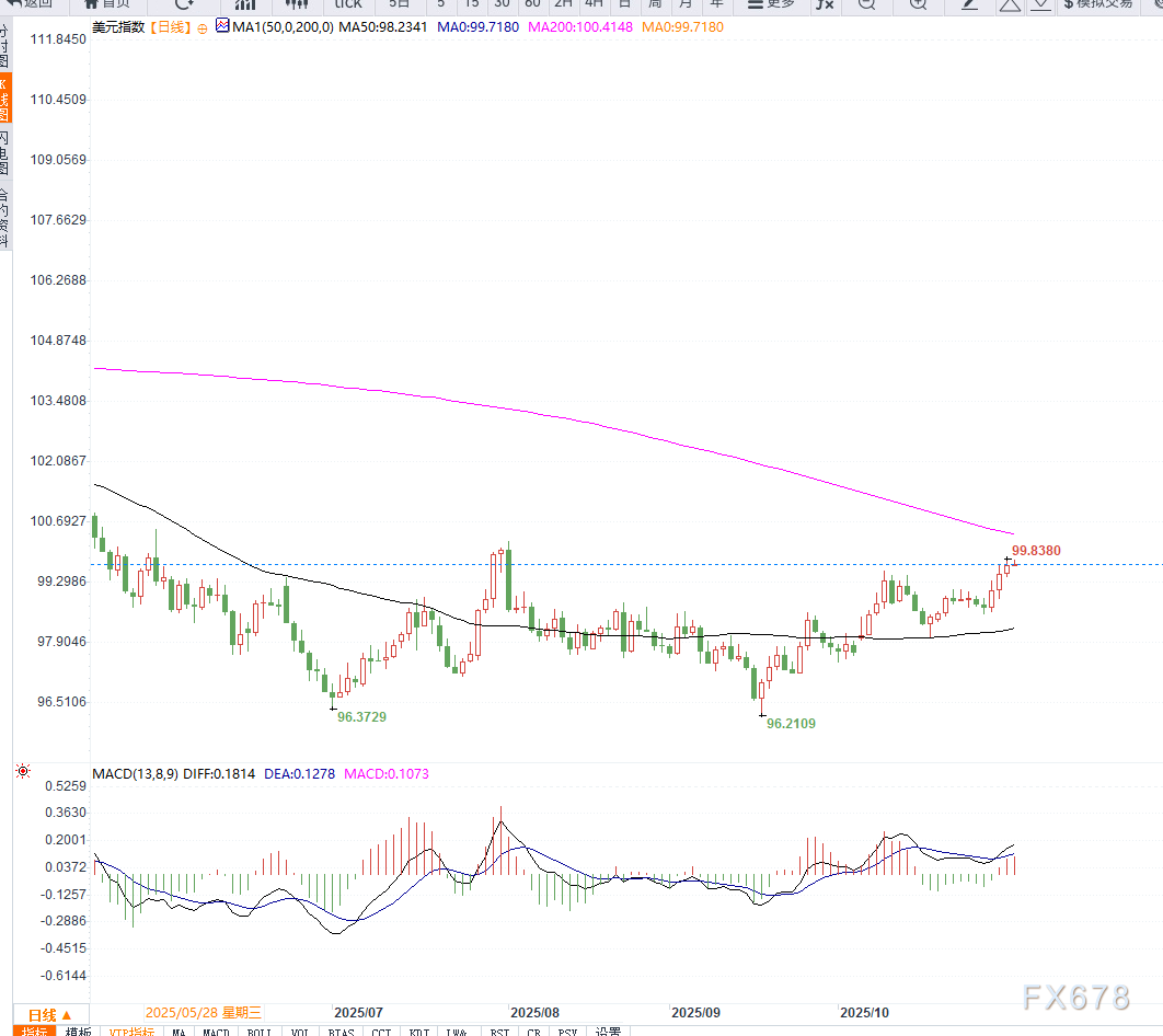 从技术面来看,美元指数在日线图上自98.50反弹后,呈现温和上行趋势。目前价格运行在9日指数移动平均线(EMA)上方,短线支撑位于99.20,阻力位于100.10。