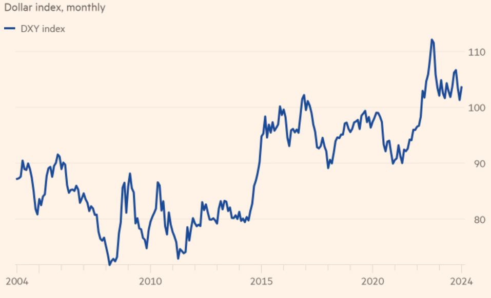 休斯指出,迄今为止2024年表现最佳的资产,很有可能美元并不是第一个浮现在脑海的。随着股市创下历史新高,债券下注降息,这种平凡的美元并没有成为头条新闻。但自12月底以来,美元已上涨了2.3%,超过了美国股票(上涨1.7%)和债券(下跌1.2%)。根据预测,由于美联储的降息使美元变得不那么吸引人,今年美元应该走弱,休斯认为这本是不应该发生的。
