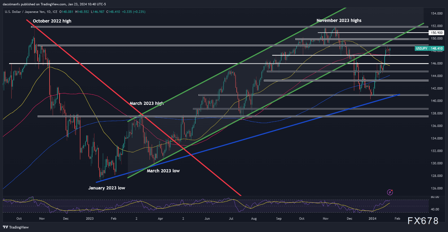 看看美元兑日元,正如下面的日线图所示,经过短期的市场盘整后,价格似乎准备开始下一阶段的上涨。美元兑日元接近149.00附近的关键阻力位。如果买家成功将汇率推高到这个阻力之上,那么对150.00重要关口的重新测试可能指日可待。
