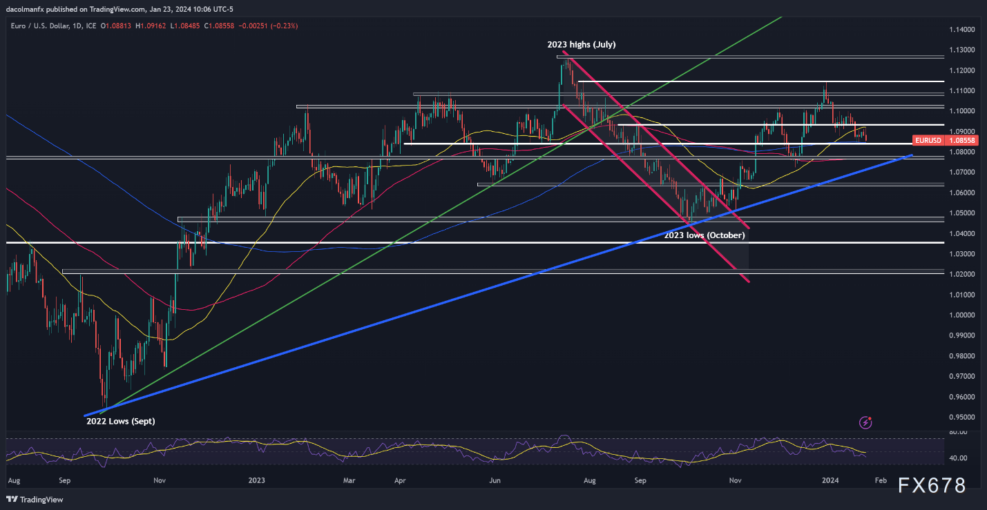 周三(1月24日),欧盘时段,欧元兑美元震荡走高,盘中报1.0904,涨幅0.47%。美元兑日元震荡走低,盘中报147.505,跌幅0.57%。美元兑加元盘中报1.3438,跌幅0.16%。
