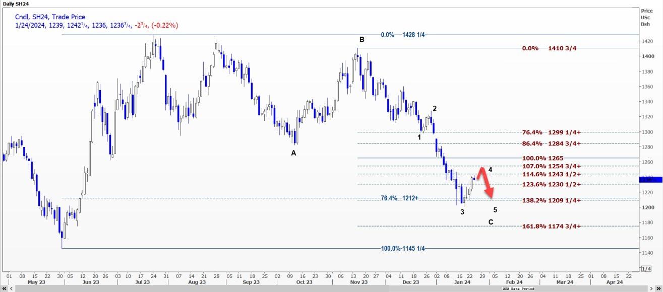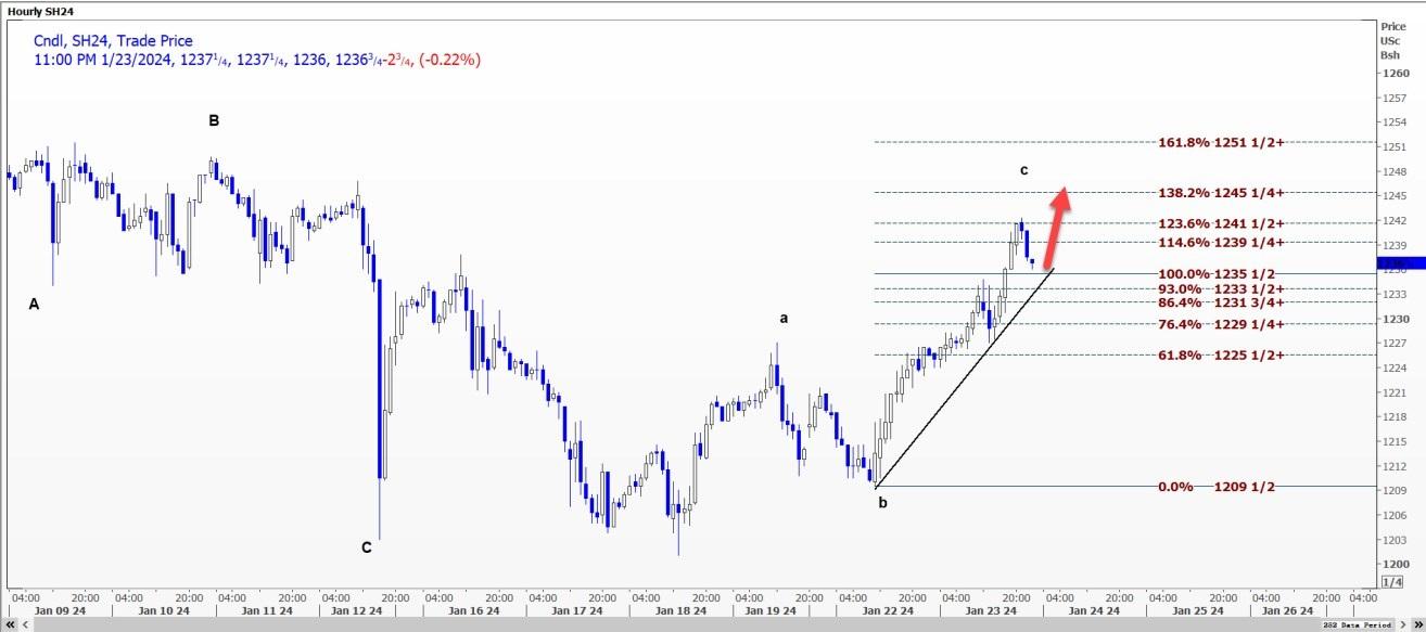 CBOT大豆3月合约SH24可能稳定在每蒲式耳12.3175-12.3350美元的支撑区域,并重新测试12.4150美元的阻力位。