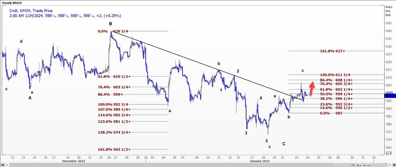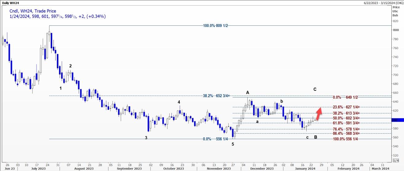 CBOT 3月小麦WH24可能会重新触及周二每蒲式耳6.0675美元的高点,因为它可能已经从该水平完成回调。