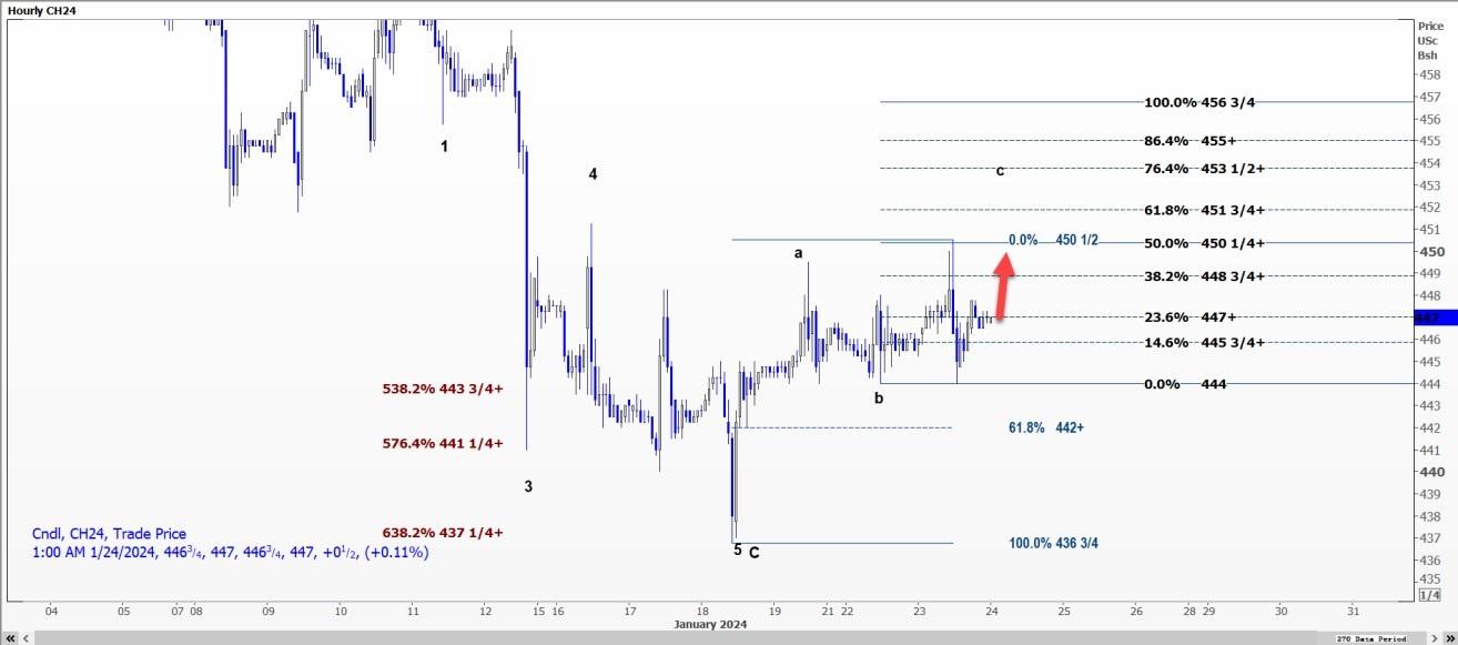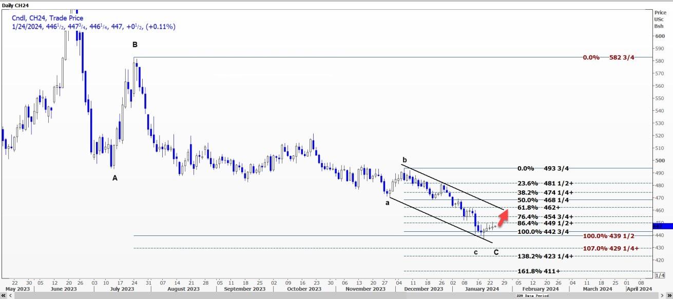 CBOT 3月玉米CH24可能会测试每蒲式耳4.4875美元的阻力位,突破该阻力位可能会导致涨至4.5025-4.5175美元的区间。