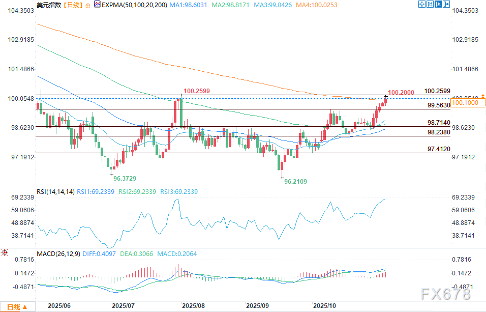 周二(11月4日),美元指数升至三个月高点,在略微回落之前达到100.215。这是自8月初以来首次突破心理关口100,但未能超过8月1日的高点100.257。下一个主要技术阻力是200日移动均线100.421,这一水平可能会决定当前五日反弹的方向。