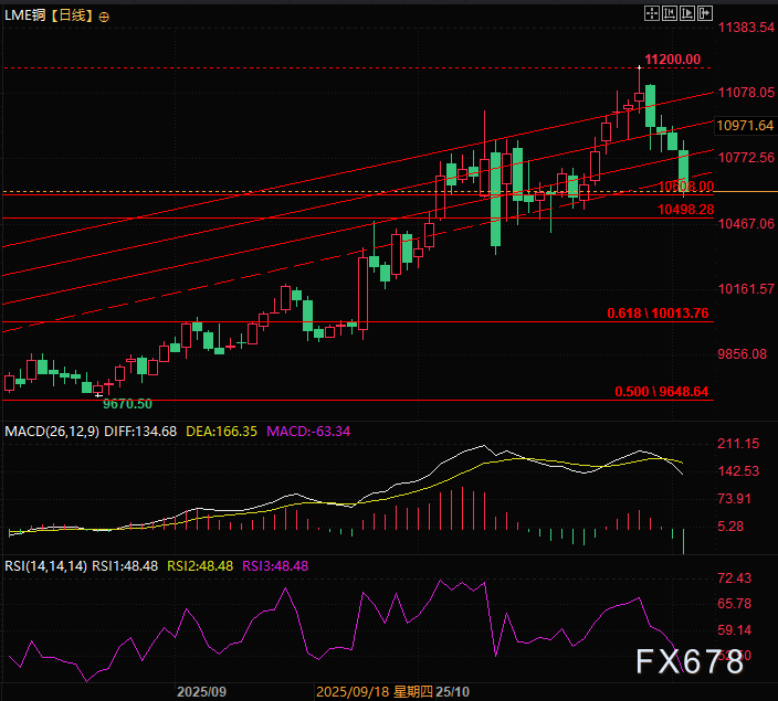 通过LME日线图可知,LME铜突破历史高点后回调,斐波那契数列0.809分位为10608。此处同时为前期交易密集区,此处为关键支撑,铜价多空双方可能依据此位置展开拉锯。