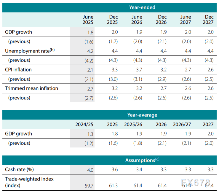 由于本次会议恰逢澳洲联储更新经济预测,其声明大量着墨于对GDP增长、失业率和通胀前景的修正。更新后的关键预测如下表所示:尽管假设的降息次数少于此前,最新展望仍显示未来数年通胀将持续高于目标,失业率仅微幅上升,经济增长保持稳健。