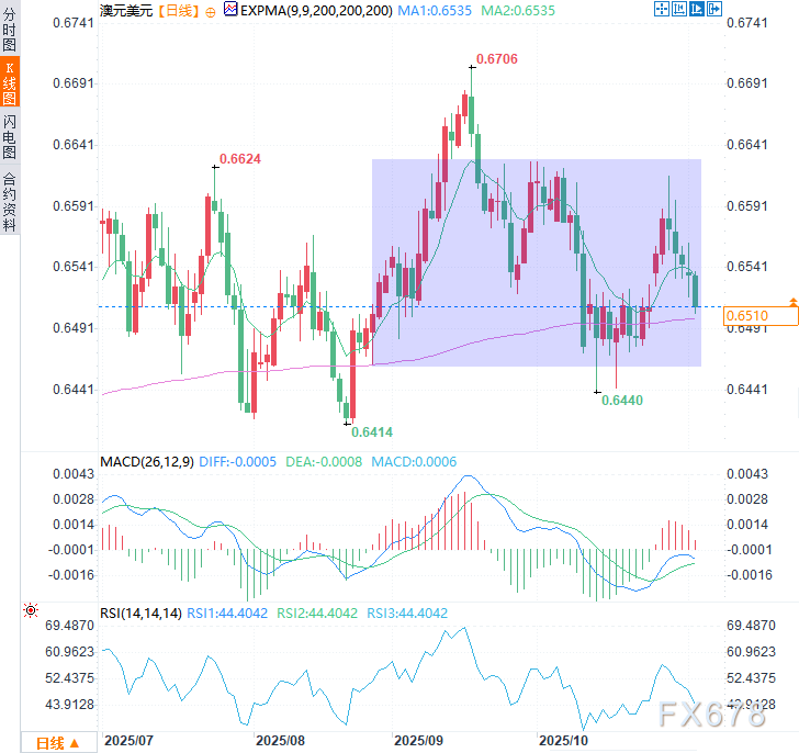 市场已下调宽松预期,周二(11月4日)澳元兑美元震荡下行,跌幅约0.31%,澳元兑美元已连续五个交易日走低。由于动能信号呈中性,价格动作将决定下一步走向。