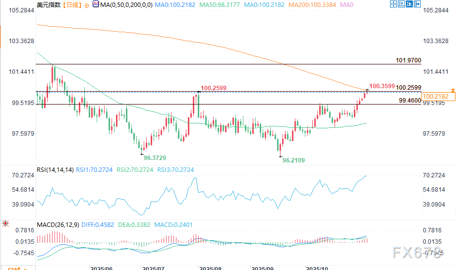 周三(11月5日),美元指数重拾涨势,最高触及100.360,创下8月初以来的最高水平。这一表现使其仅略低于100.383的200日均线——这一技术阻力位现已成为决定美元走势的关键战场。