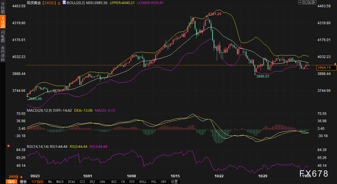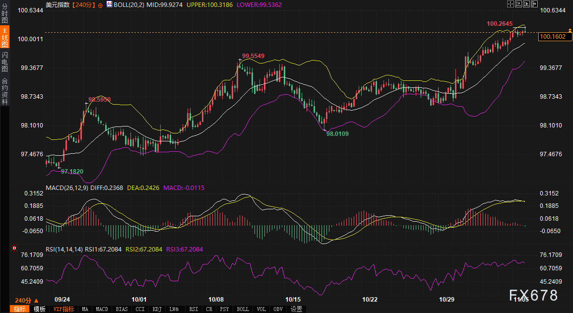 美元指数在240分钟图上于布林带中轨99.93附近徘徊。MACD指标出现轻微背离,但RSI升至67.20,表明短期动能虽有放缓,整体仍处于横盘整理格局,尚未有效测试100.32的上轨阻力。这与美债短期收益率的坚挺相互呼应。