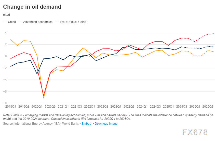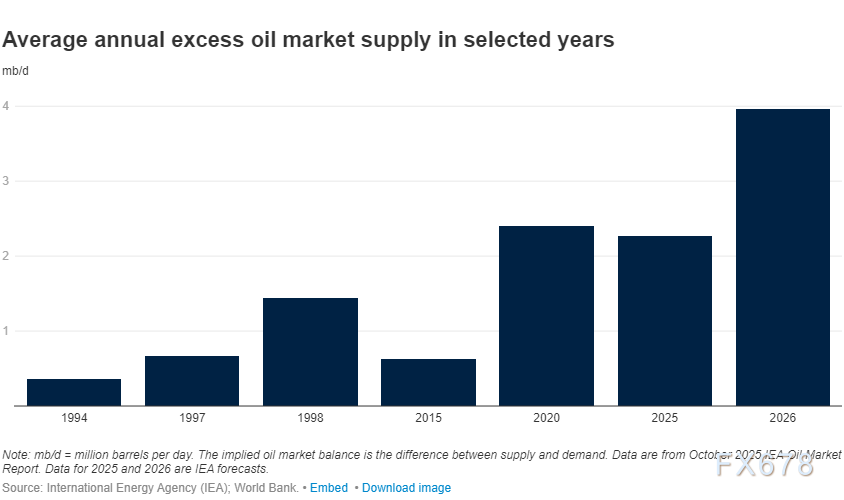 尽管2025年观察到的库存增长仅反映了约一半的隐含过剩量,但近期市场动态越来越多地表明全球石油供应过剩正在显现:中东地区近期有多艘原油货船滞销,与此同时,海上油轮载油量也出现激增。按年度计算,国际能源署(IEA)预计2025年石油过剩量为230万桶/日,2026年将增至400万桶/日,比2020年疫情爆发期间的过剩量高出160万桶/日。