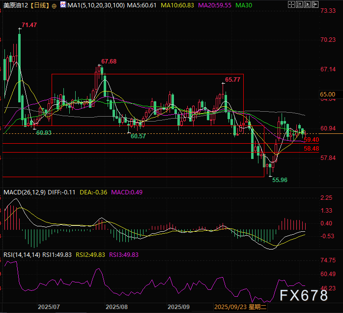 美原油12月期货合约目前维持在箱体上半区域呈现震荡走势,压力位在61.30支撑位在59.40和58.48附近。