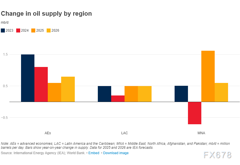 2025年,中东和北非、阿富汗及巴基斯坦(MNA地区)的石油供应增长预计将恢复,拉丁美洲和加勒比地区(LAC地区)将加速增长,而发达经济体的供应增长则会放缓。2025年石油供应增量中,近一半来自石油输出国组织及其合作伙伴(OPEC+),这反映出该组织提高了产量目标。