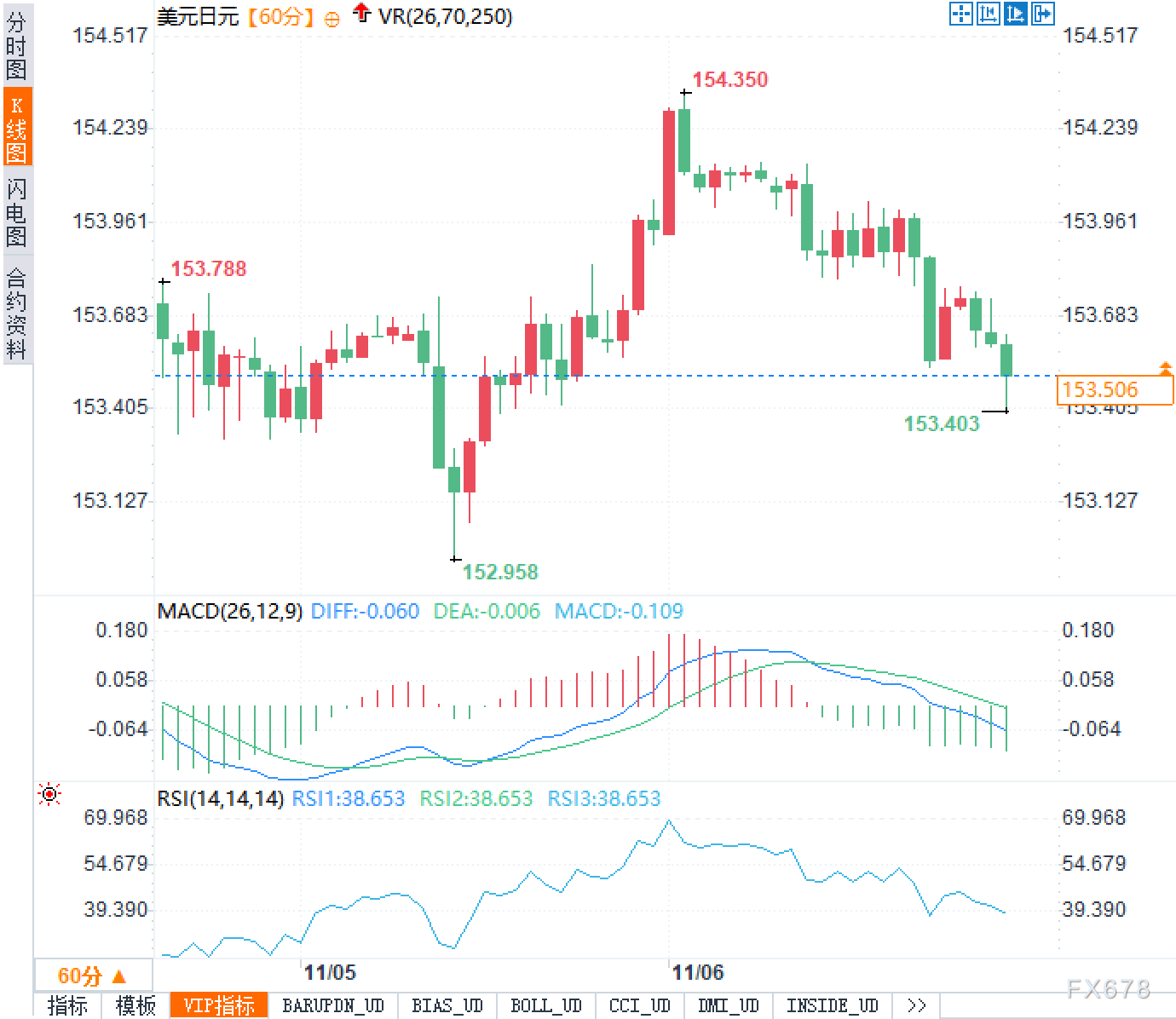 美元兑日元60分钟图显示,价格自154.35回落后围绕153.50一线交投,区间约153.40—153.90/154.35。近期K线影线偏长、实体收窄,分歧上升。MACD快慢线在零轴上方拐头下行并扩散,柱能转负,动能偏弱;RSI自50上方回落至40附近,未触及极端,属回落中的时间换空间。