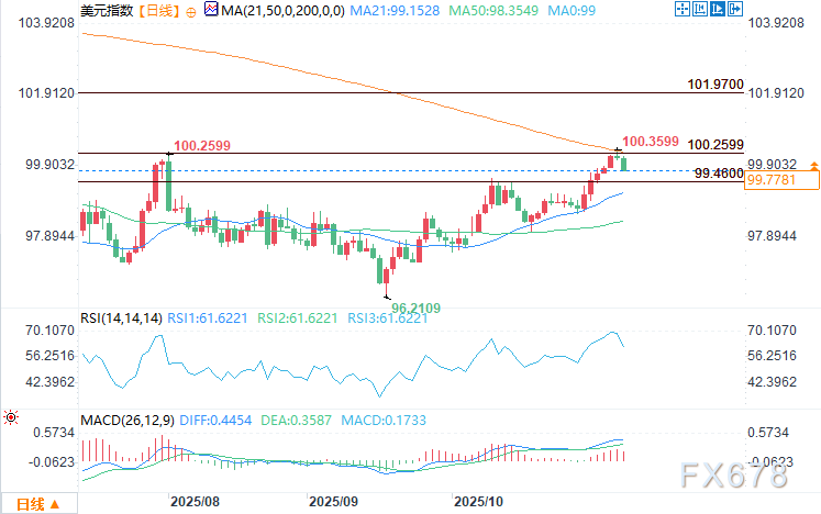 周四(11月6日)美盘时段,劳动力市场疲软拖累美元和收益率,美元指数下跌,在本周早些时候尝试突破100.360失败后,其回调幅度扩大至200日均线以下。该指数下跌0.3%,至99.753。在裁员公告激增和美国国债收益率普遍下降后,风险情绪变得谨慎。