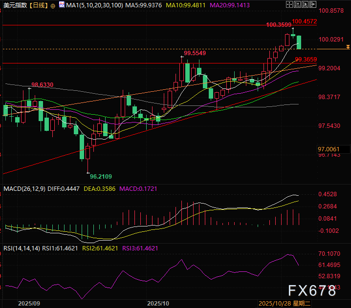 美元指数突破上升楔形后,在100.45量度涨幅面前停止脚步,目前跌破5日线跌穿100整数关口,跌幅0.41%。
