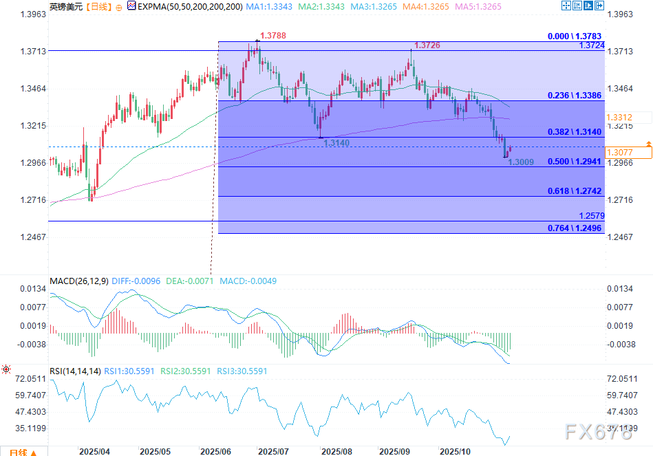日线图显示,英镑/美元汇率在过去几个月大幅下挫,从9月1.3726的高点跌至本周1.3009的低点。