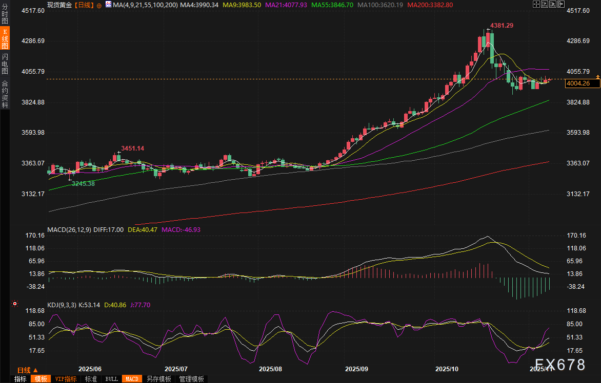 周一(11月10日)亚市早盘,现货黄金守住上周五涨势,一度涨至4010美元/盎司上方,较上周五收盘价4001.27美元/盎司上涨约0.2%。上周五金价上涨0.6%,成功收复4000整数关口。市场人士指出,美元指数的意外走软成为首要推手,上周五美元下跌0.15%至近一周低位,这使得以美元计价的黄金对持有其他货币的投资者而言变得更加便宜,吸引了大量海外买盘涌入。同时,美国政府关门的不确定性如阴霾般笼罩市场,显著提升了黄金的避险属性,而华尔街股指即将录得大幅周度跌幅,进一步放大了这一效应。科技股为主的纳斯达克指数上周五录得七个月来最大单周跌幅,投资者对人工智能股票涨势可持续性的担忧情绪升温,推动资金从风险资产重新转向黄金这一传统避险天堂。