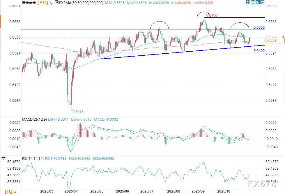 周一(11月10日)欧盘时段,澳元/美元盘中报0.6528,涨幅0.52%。澳洲联储(RBA)维持利率不变后,澳元/美元汇率在关键支撑位附近维持窄幅波动。该货币对当前较今年迄今高点0.6700有所回落。