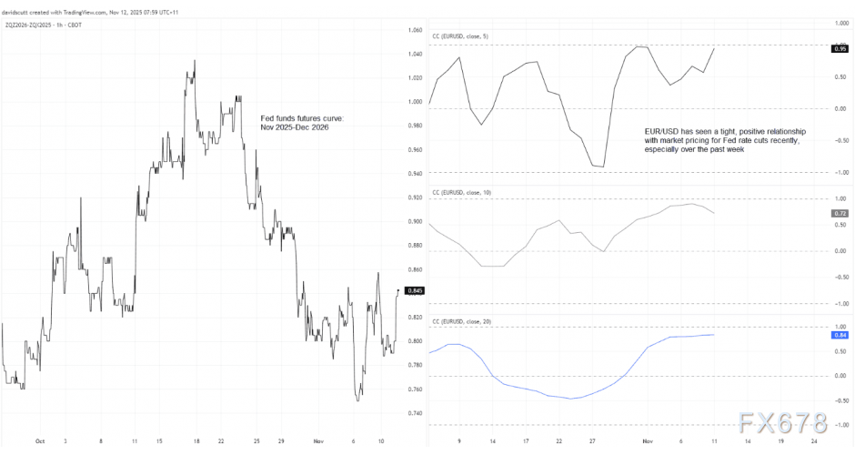 过去一个月(尤其是最近一周),欧元/美元与市场对美联储截至2026年底的降息预期变化高度同步。