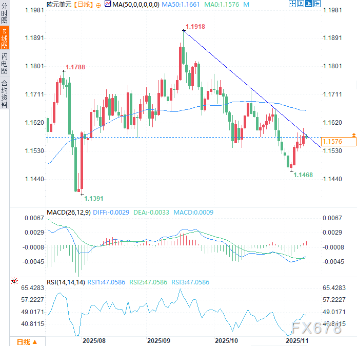 上行方面,若汇价有效突破并收于9月趋势线上方,将强化看涨动能,后续目标位可看向1.1650、50日均线(MA,1.1661)或1.1780。