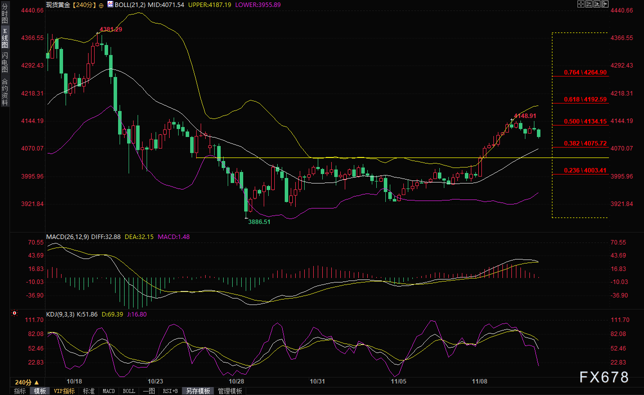 现货黄金在周三(11月12日)亚洲时段徘徊于三周高位下方小幅承压,目前交投于4106.24美元/盎司附近,跌幅约0.5%,多头在定位进一步升值之前等待突破4150-4155美元的水平阻力位。投资者似乎相信,延迟发布的美国宏观数据将显示经济疲软(因美国政府长期关闭),并促使美联储(Fed)在12月进一步降低借贷成本。鸽派前景使美元保持在周二触及的近两周低点附近,成为非生息黄金的关键顺风因素。