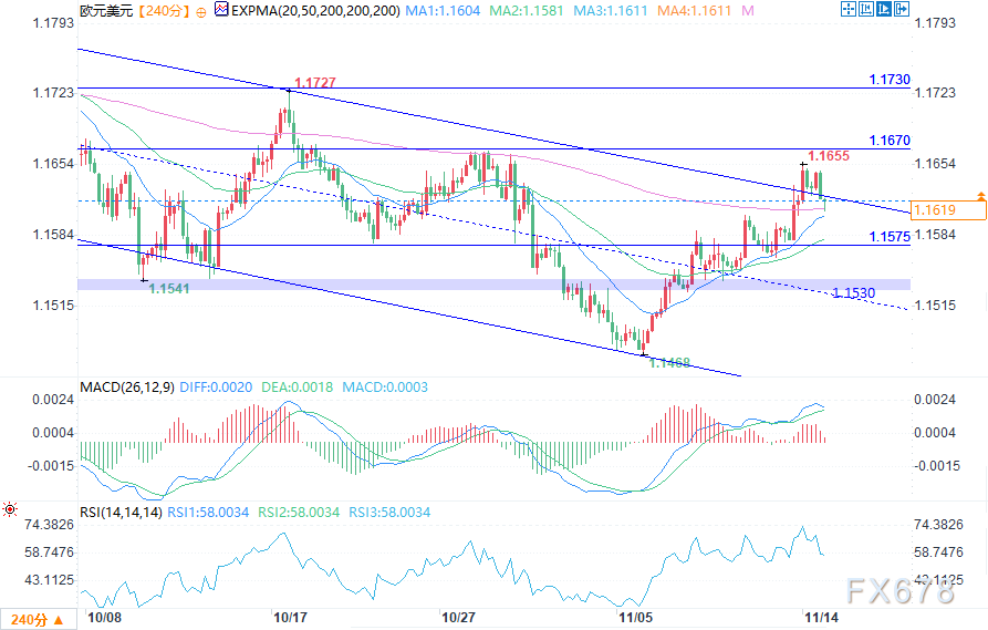 周五(11月14日)欧盘时段,欧元/美元在连续七个交易日上涨后缩减涨幅,发稿时交投于1.1615,本周仍有望上涨0.45%。