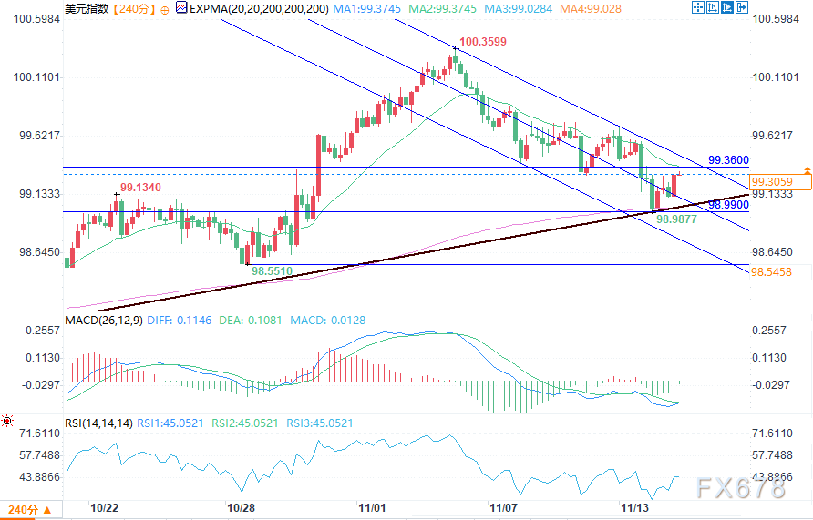 周五(11月14日)欧盘时段,美元指数(DXY)在经历波动的周四交易后,现报99.2727附近,勉强守住关键支撑位上方。