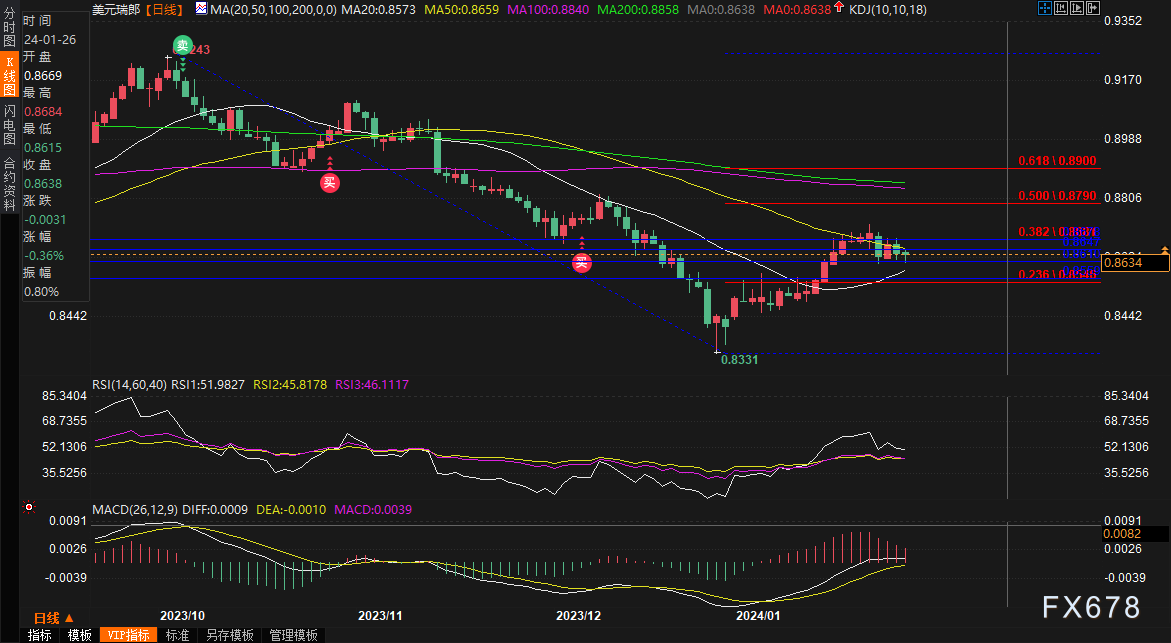 周一(1月29日),欧盘时段,美元/瑞郎小幅走跌。美元/瑞郎在亚盘开盘走高后回落走平,在欧盘迅速下跌后回升,实现V型反转。现报0.8629,跌幅0.10%。瑞郎主力现报1.1645,涨幅0.12%。
