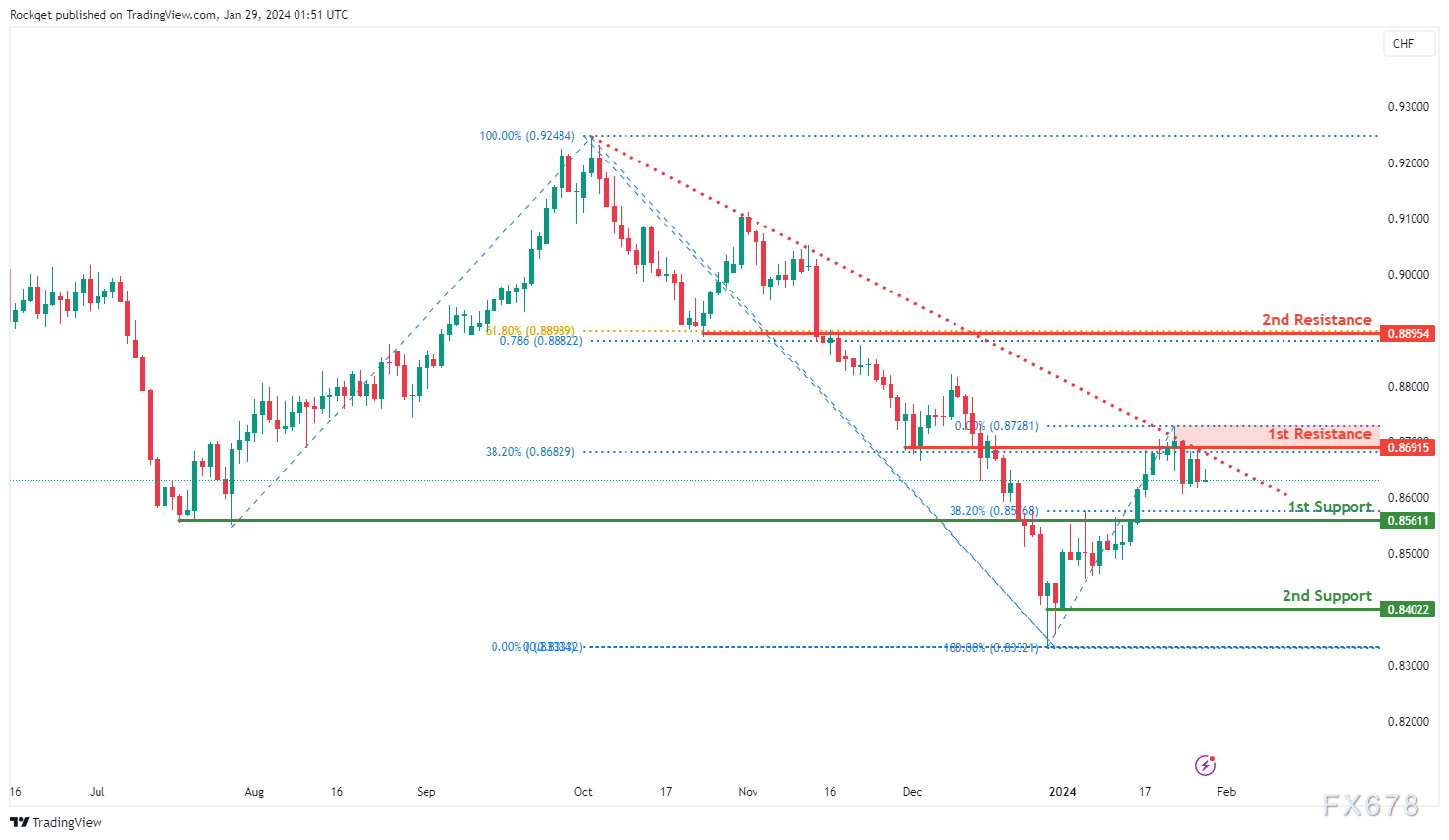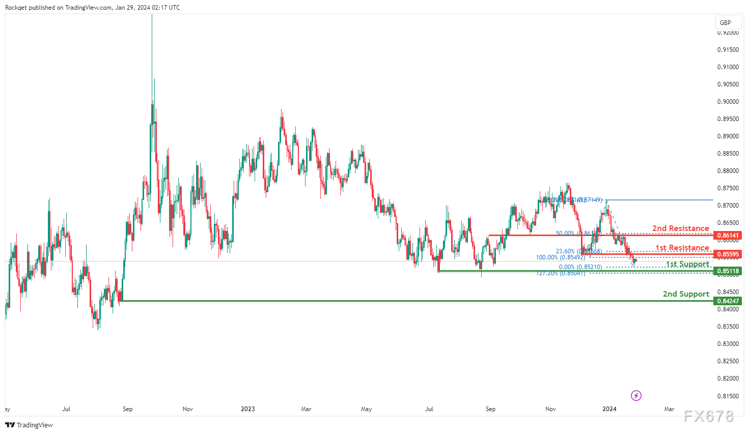 第二个阻力位0.86140也被归类为重叠阻力位,与50%斐波那契回撤位重合,进一步突出了其作为潜在阻力位的重要性。