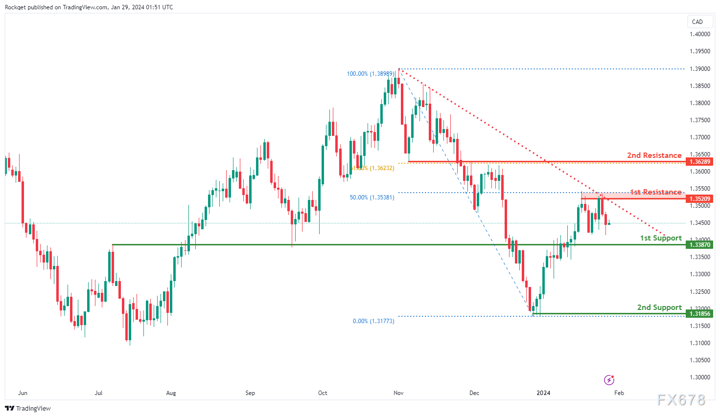 上行方面,第一个阻力位1.3520被确定为回调阻力位,该阻力位接近50.00%斐波那契回撤位。在上方,第二个阻力位1.3628被认为是与61.80%斐波那契回撤位一致的重叠阻力位,进一步强化了其作为潜在阻力区的重要性。