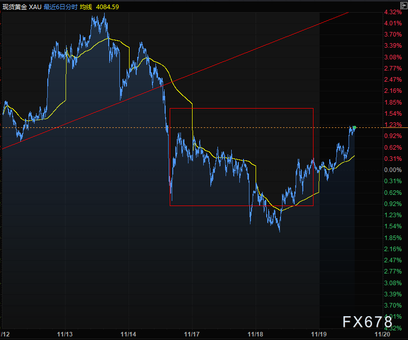 周三(11月19日)亚欧时段,现货黄金开盘小幅探底之后展开反弹,美元指数在欧洲通胀整体缓和的氛围下,守住一周高位继续反弹,会对无利息收益的黄金构成直接压制,但黄金却和美元指数出现了一同上涨的现象。