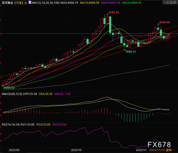 日线图显示黄金守住生生通道下轨,有望依托上升通道继续反弹,压力位在中轨的4120和远处的4185。