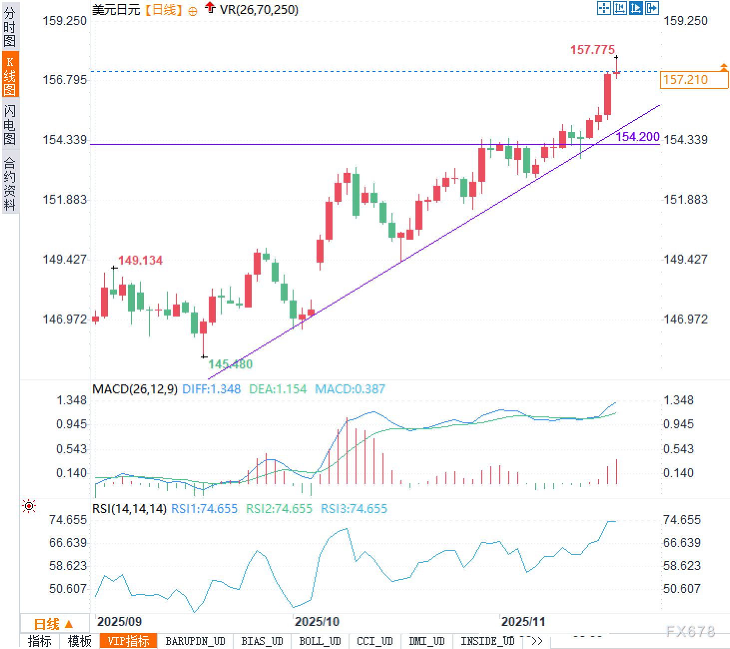从日线图看,美元兑日元自145.48一线启动上行通道,目前沿紫色趋势线稳步抬升,短期呈现加速拉升特征。前高与密集成交区154.20附近已被有效突破,并转化为重要支撑区域,当前价格157.20距离当日高点157.775不远,显示多头动能仍占优势。
