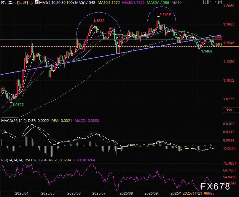 周五(11月21日)亚欧时段欧元兑美元走出小幅冲高,之后回落的走势,昨晚偏向消极的美国非农发布后欧元获得喘息机会,今天亚市时段走出温和冲高的反弹走势但随着欧元区和欧洲多国制造业PMI数据的公布,欧洲三大股指集体下跌,同时欧元兑美元大幅回落,自1.1551的高点回落近40个点,由涨转跌收出长上影线,目前交投于1.1514附近。